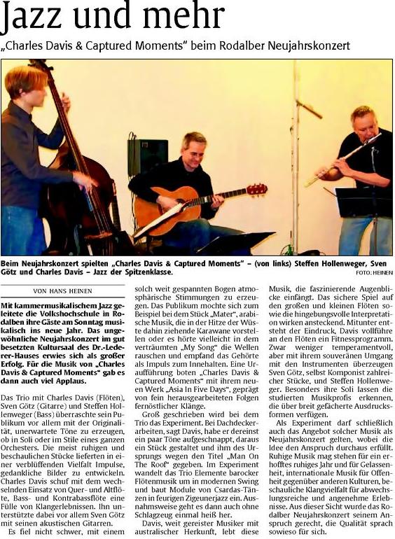 Zu der neuesten CD von Captured Moments schreibt: Klaus Mümpfer im Jazzpodium, Februar 2016 zu „Nexxt“: "Das Trio "Charles Davis & Captured Moments" durchstreifen auf ihrer musikalischen Reise nicht nur Kontinent von Europa, Arabien und Indien bis China, sondern auch Zeiten von Barock bis Rock." Für ausfürhliche Kritiken, bitte hier Klicken |